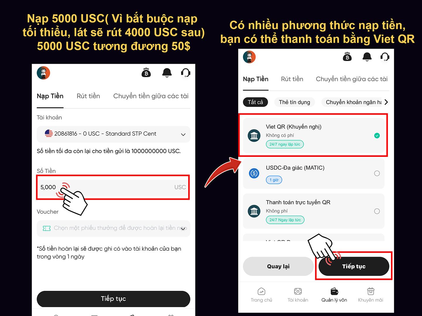 - Nạp tiền(vì nạp tối thiểu 5000USC tương đương 50$) nên khi nạp xong chúng ta sẽ tiến hành rút 4000 USC. Số tiền 10$ này sẽ được hoàn sau 2-3 ngày khi khách hàng phát sinh giao dịch, Mỗi khách hàng sẽ được hoàn 1 lần, cho dù giao dịch cháy tài khoản