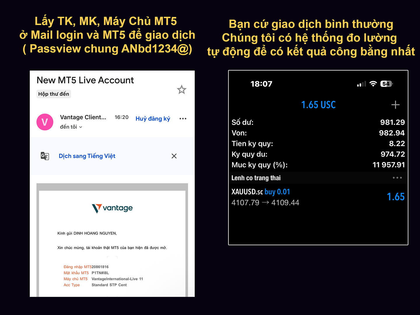 - Thông tin tài khoản MT5 đã gửi về mail( dùng để login MT5 và giao dịch, Trading Mien Trung đã tự động tracking giao dịch mỗi ngày, giải thưởng sẽ được công bố vào mỗi tuần)